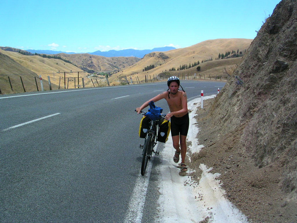 Nya Zeeland har många extremt backiga partier. Ibland är det lättare att styra cykeln, Stefan väljer att göra det här. Notera den smala vägrenen.